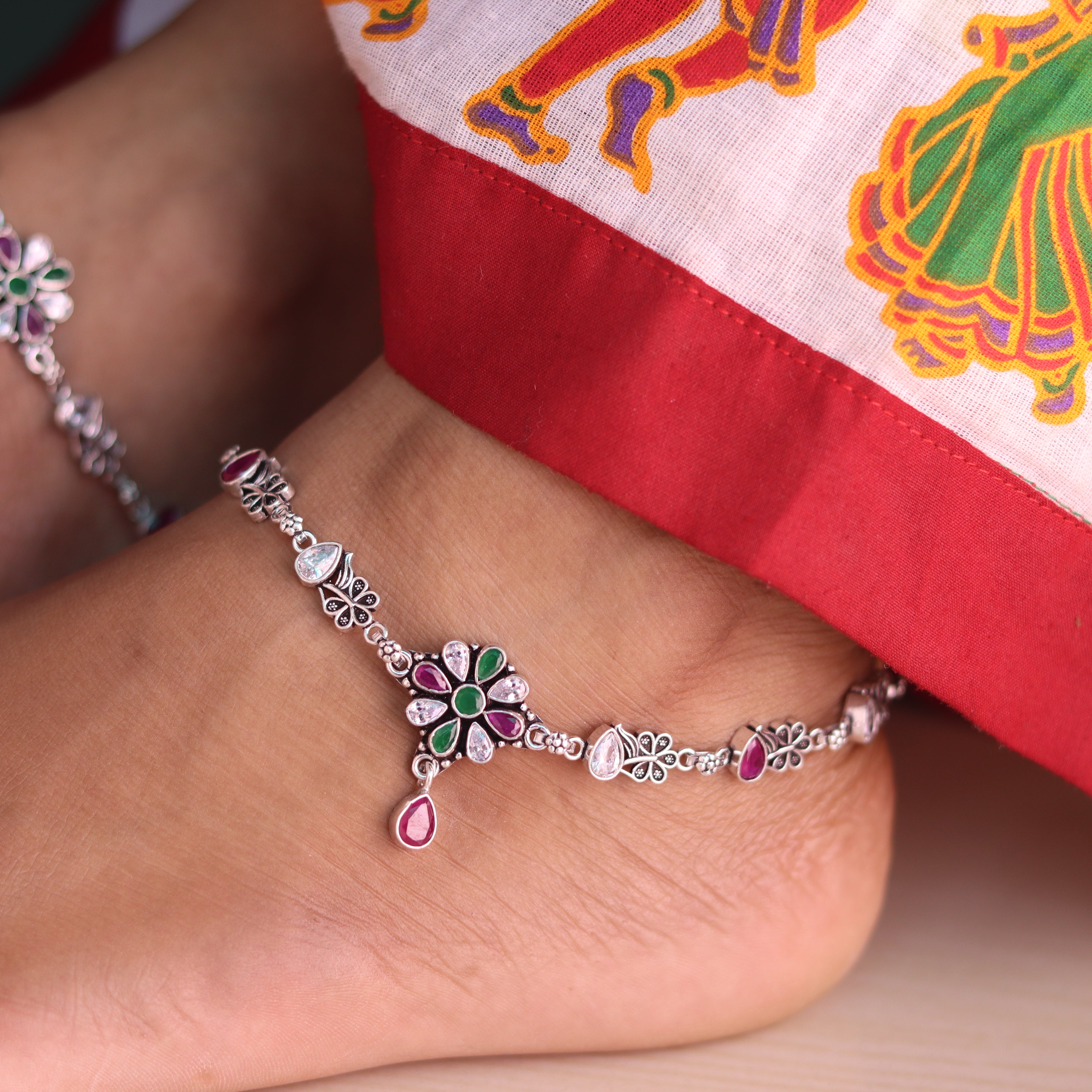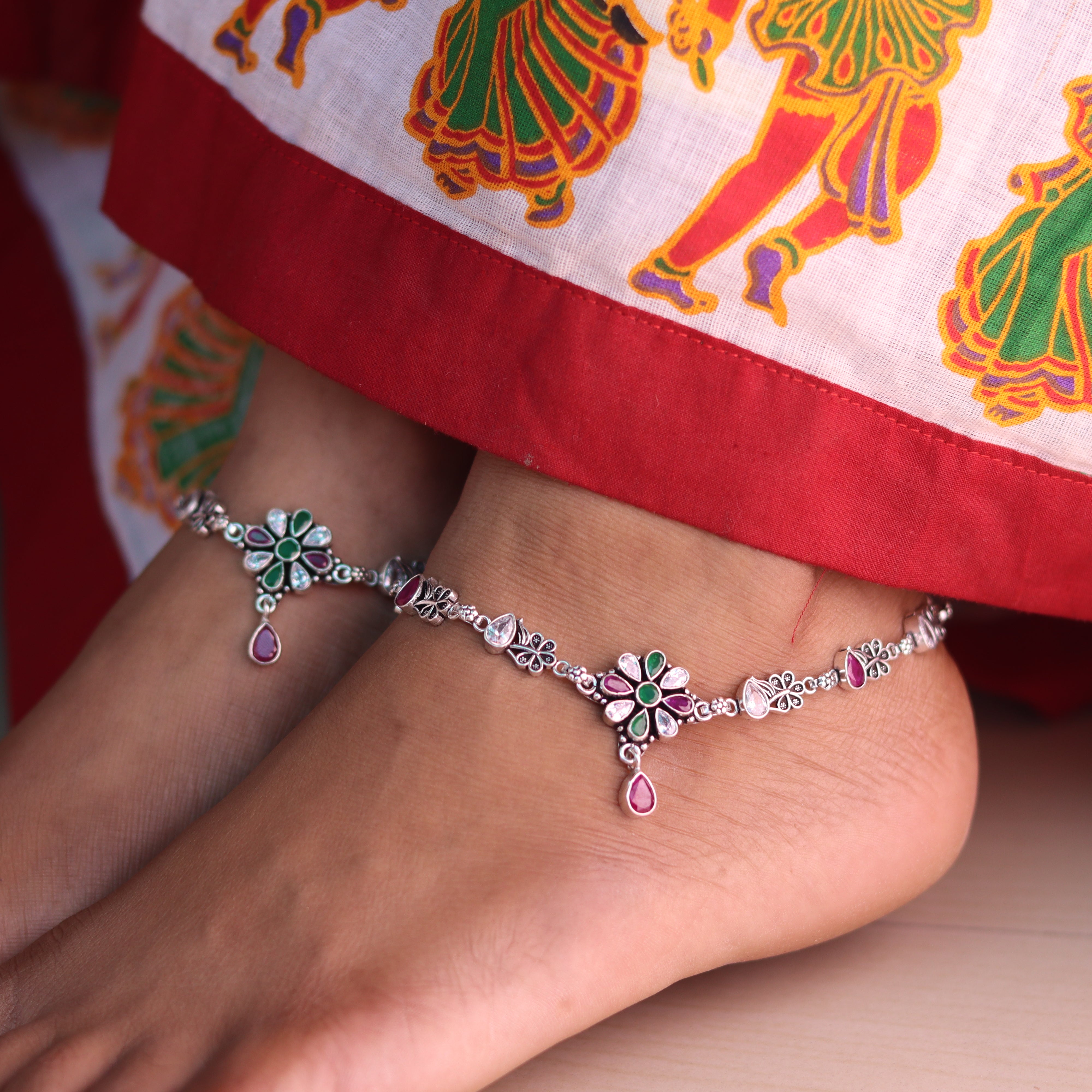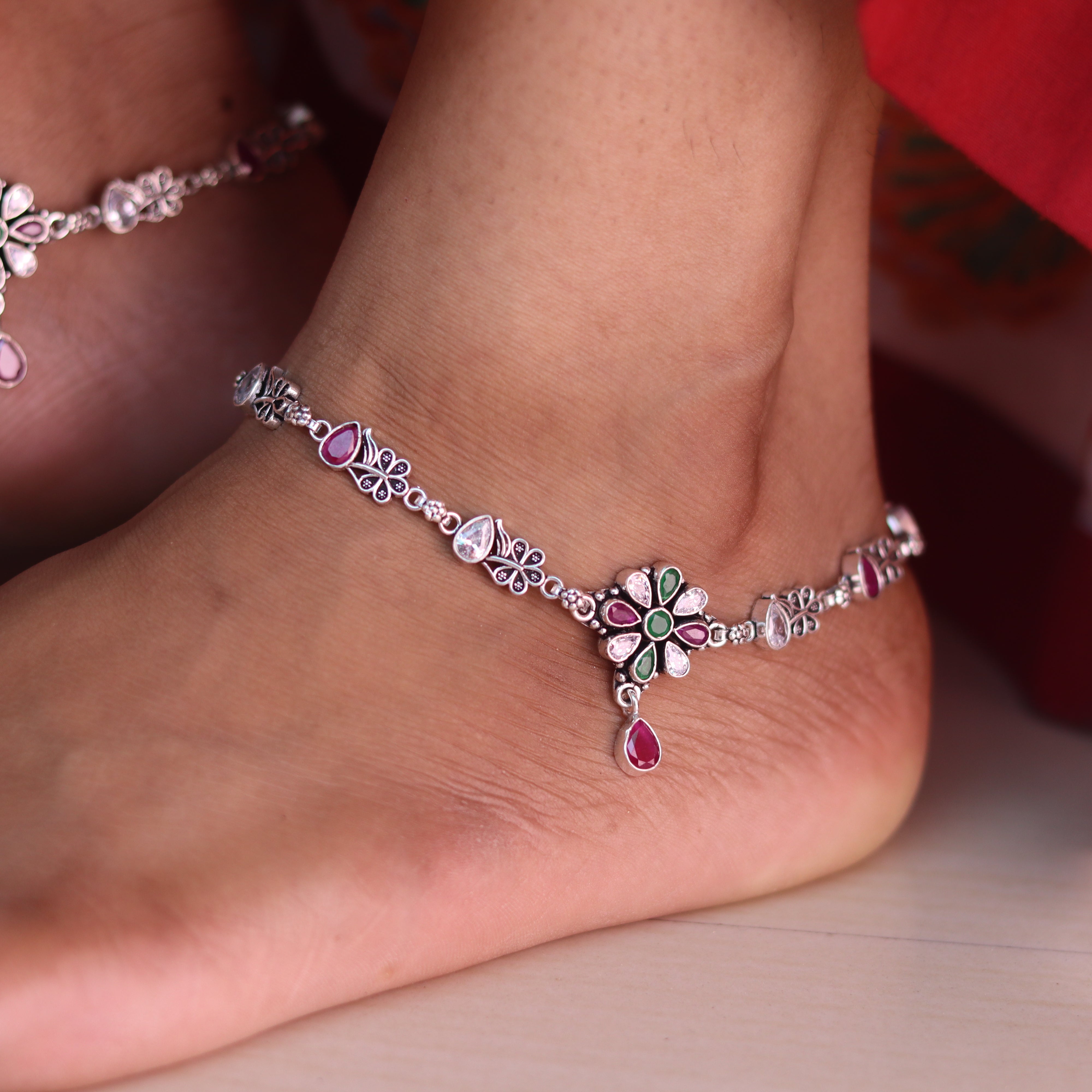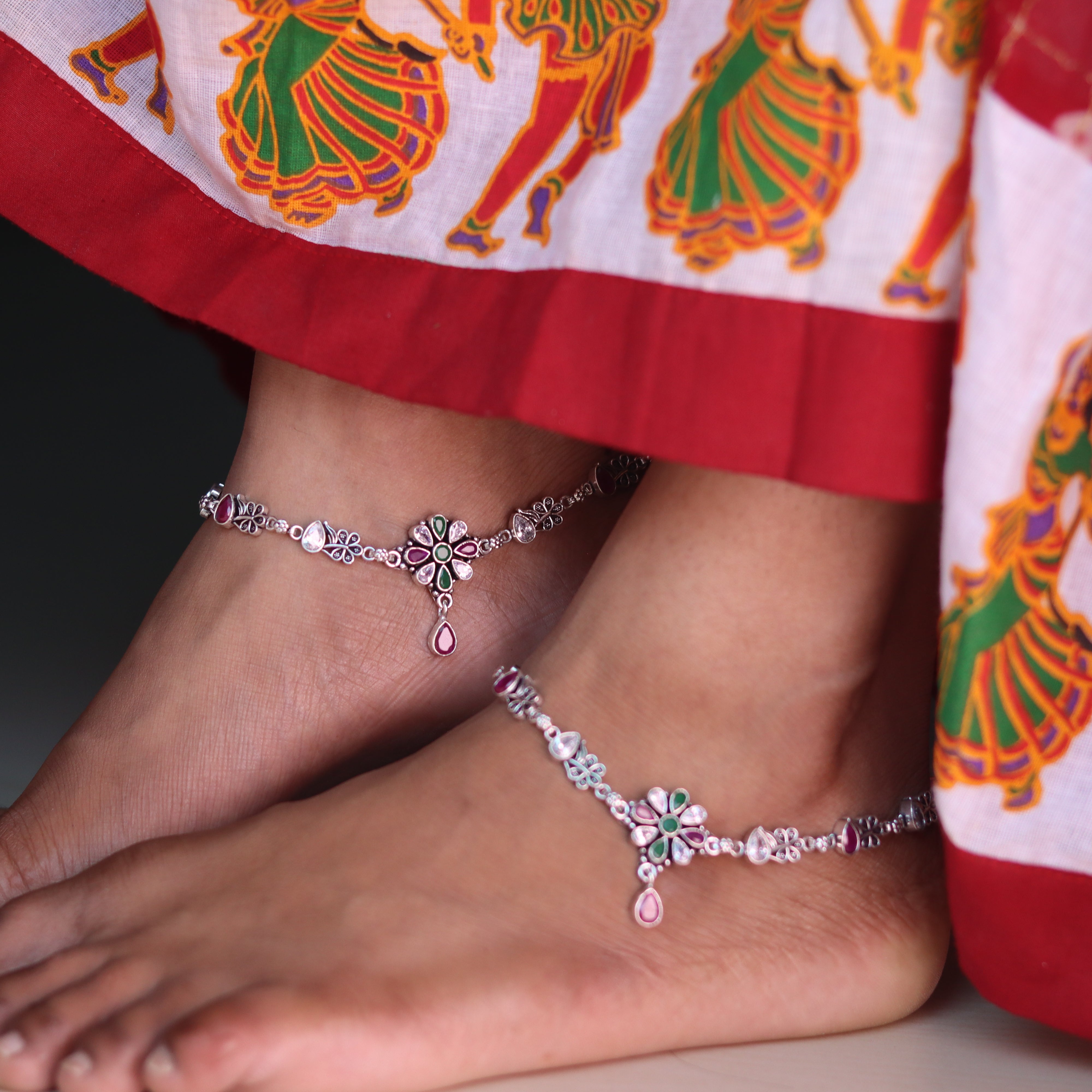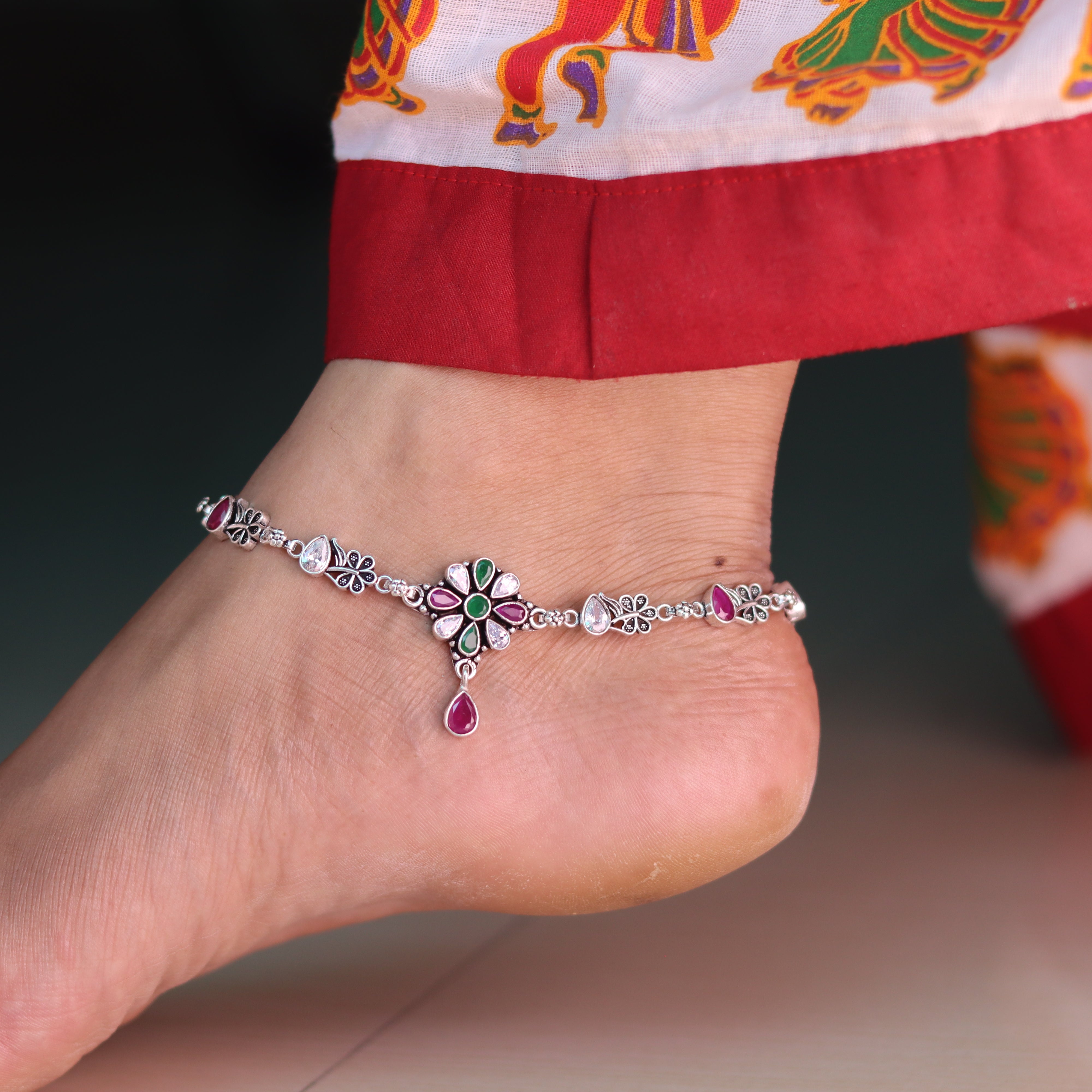 Heavy Stone-Studded Jaipuri Silver Payal for Women