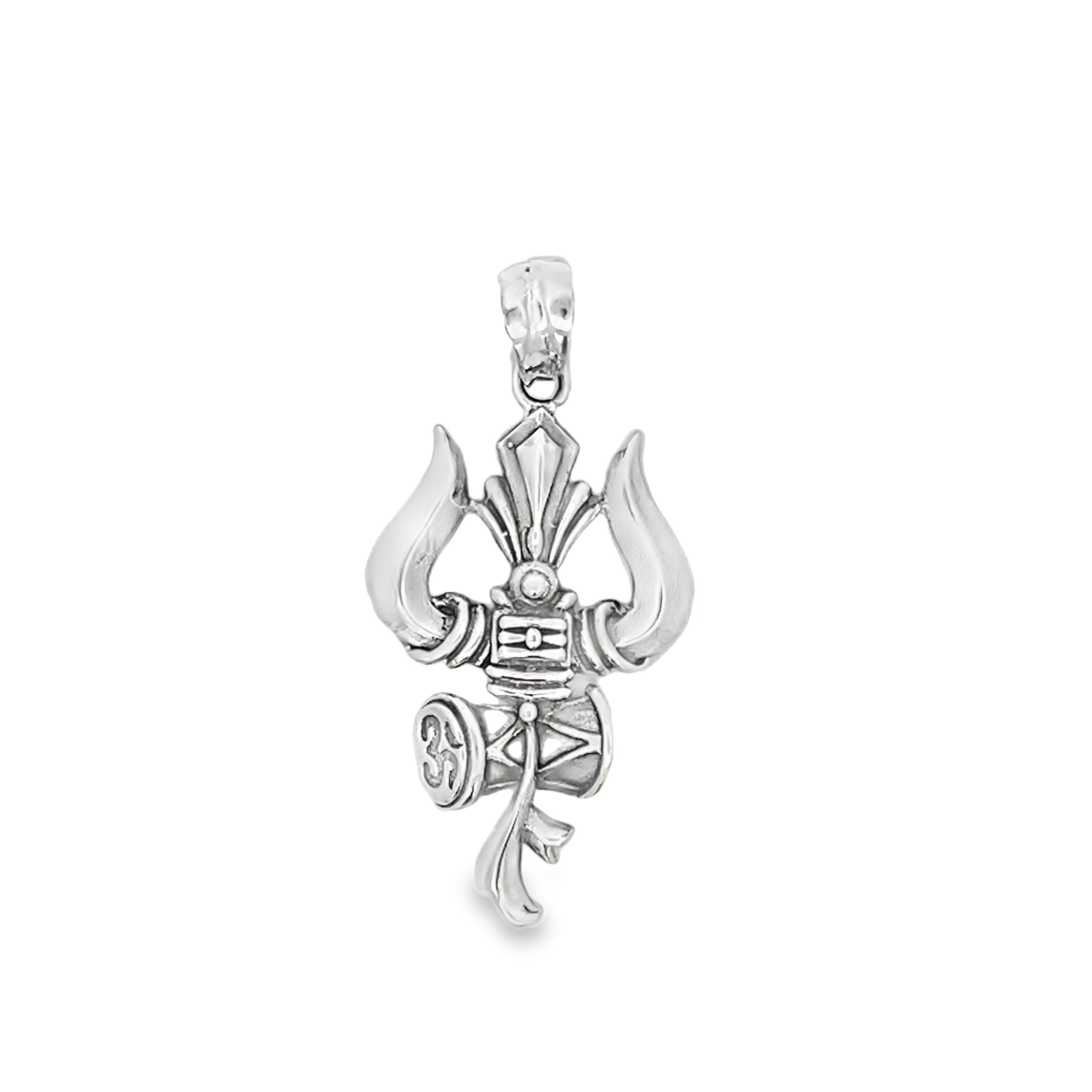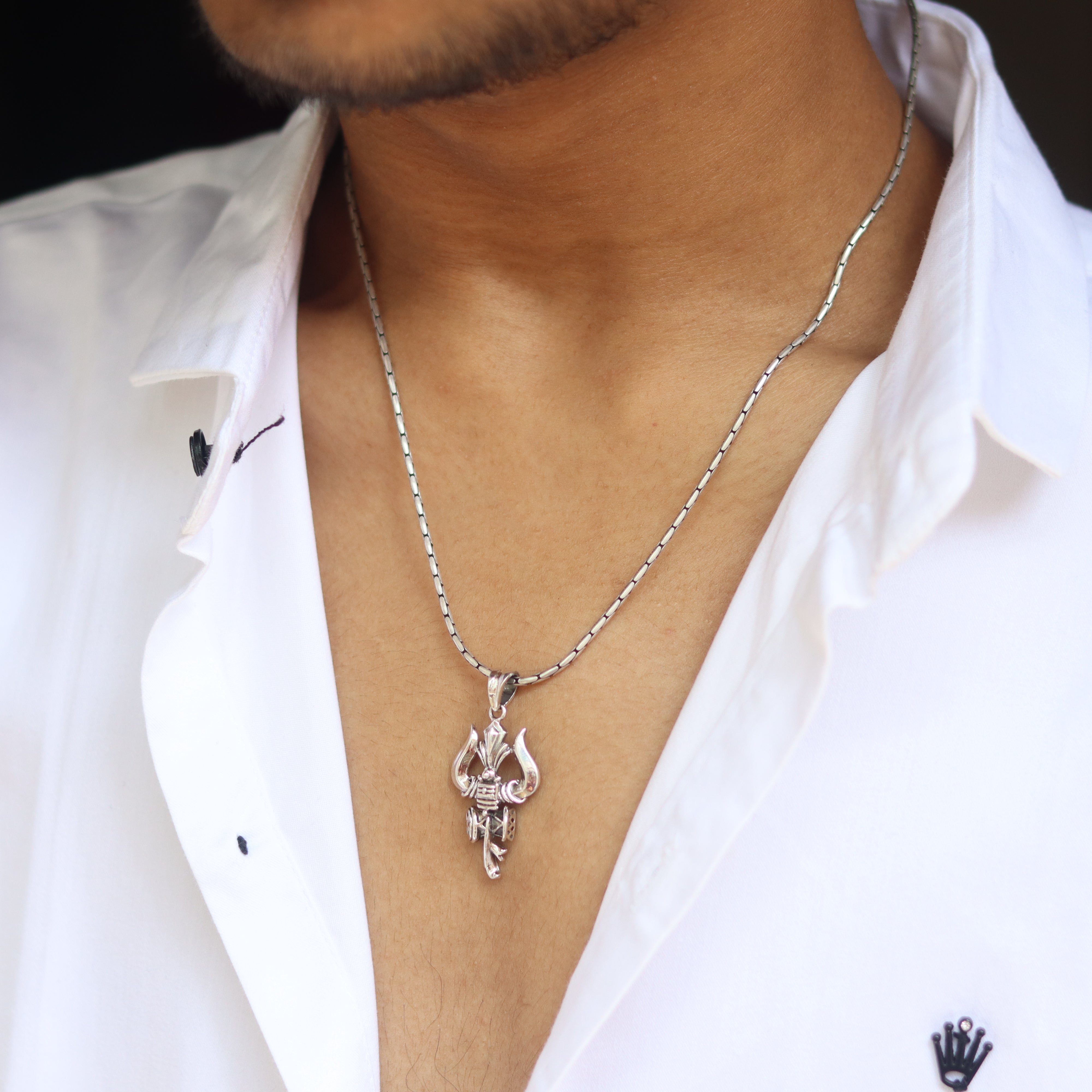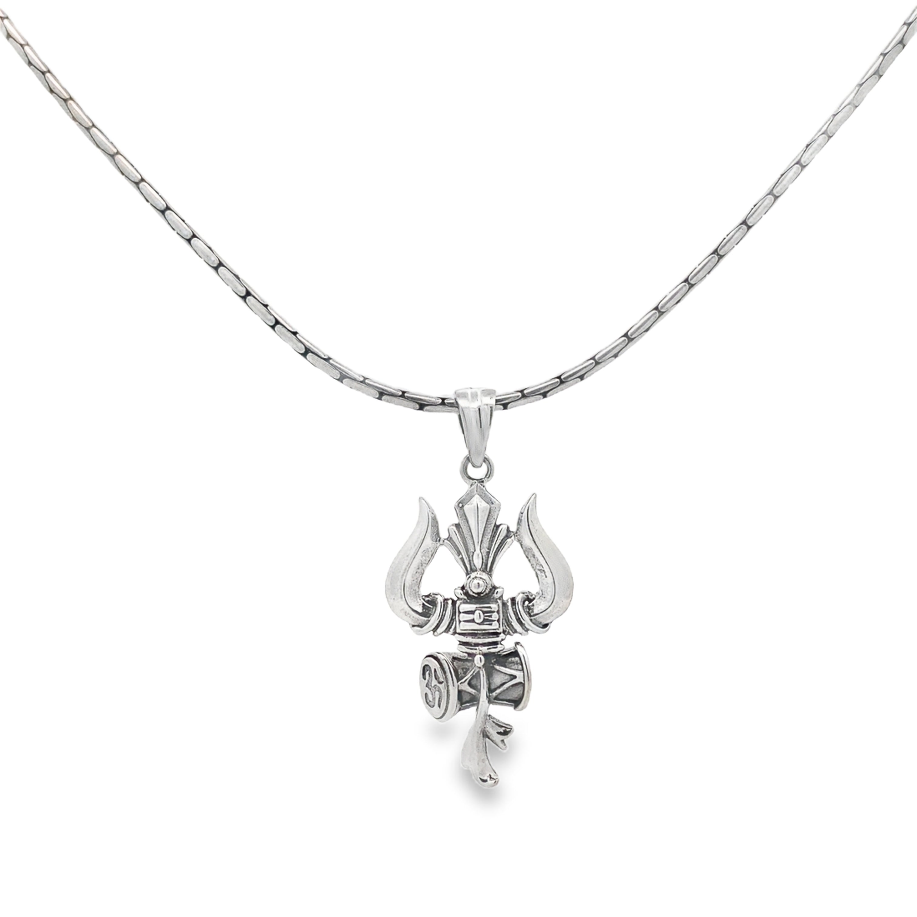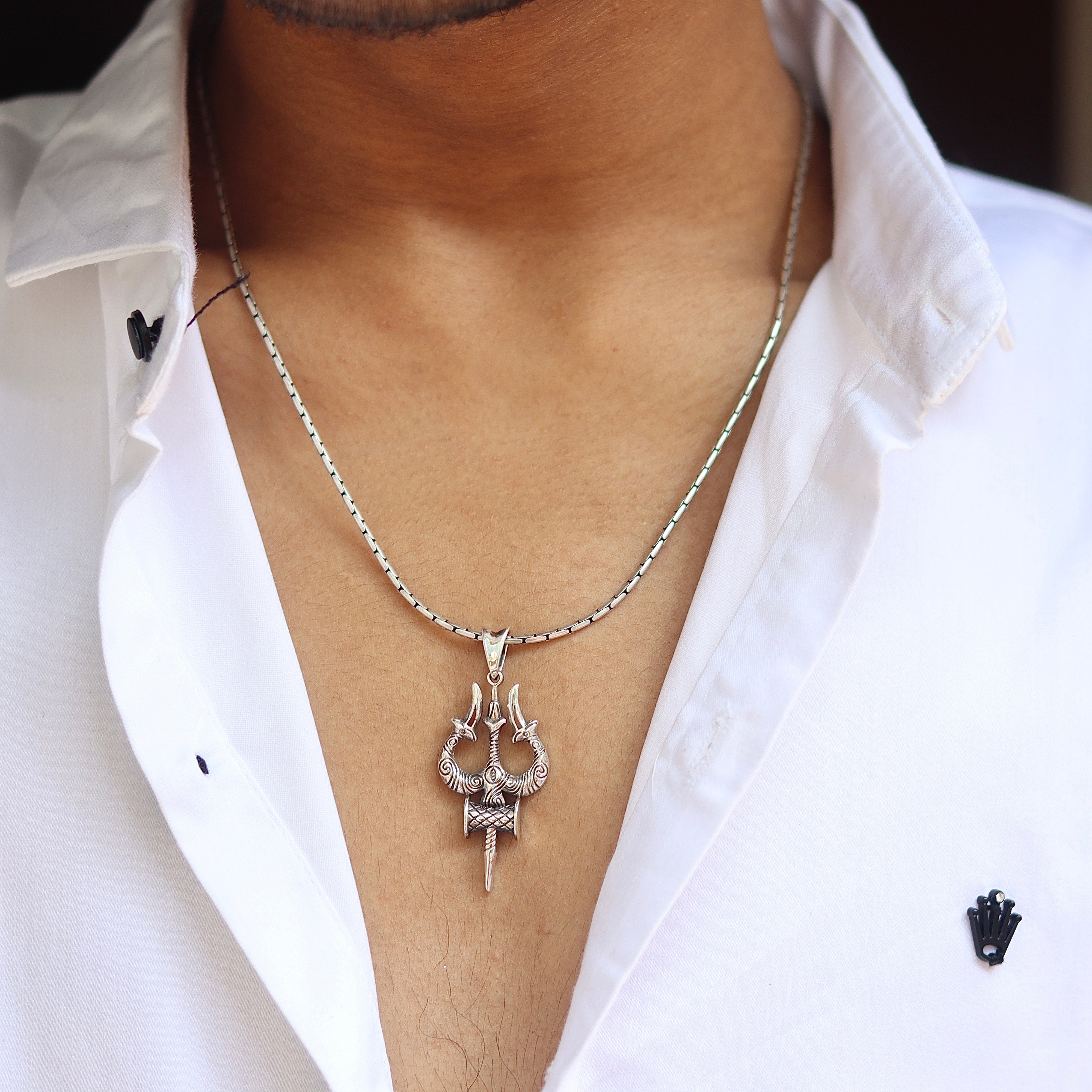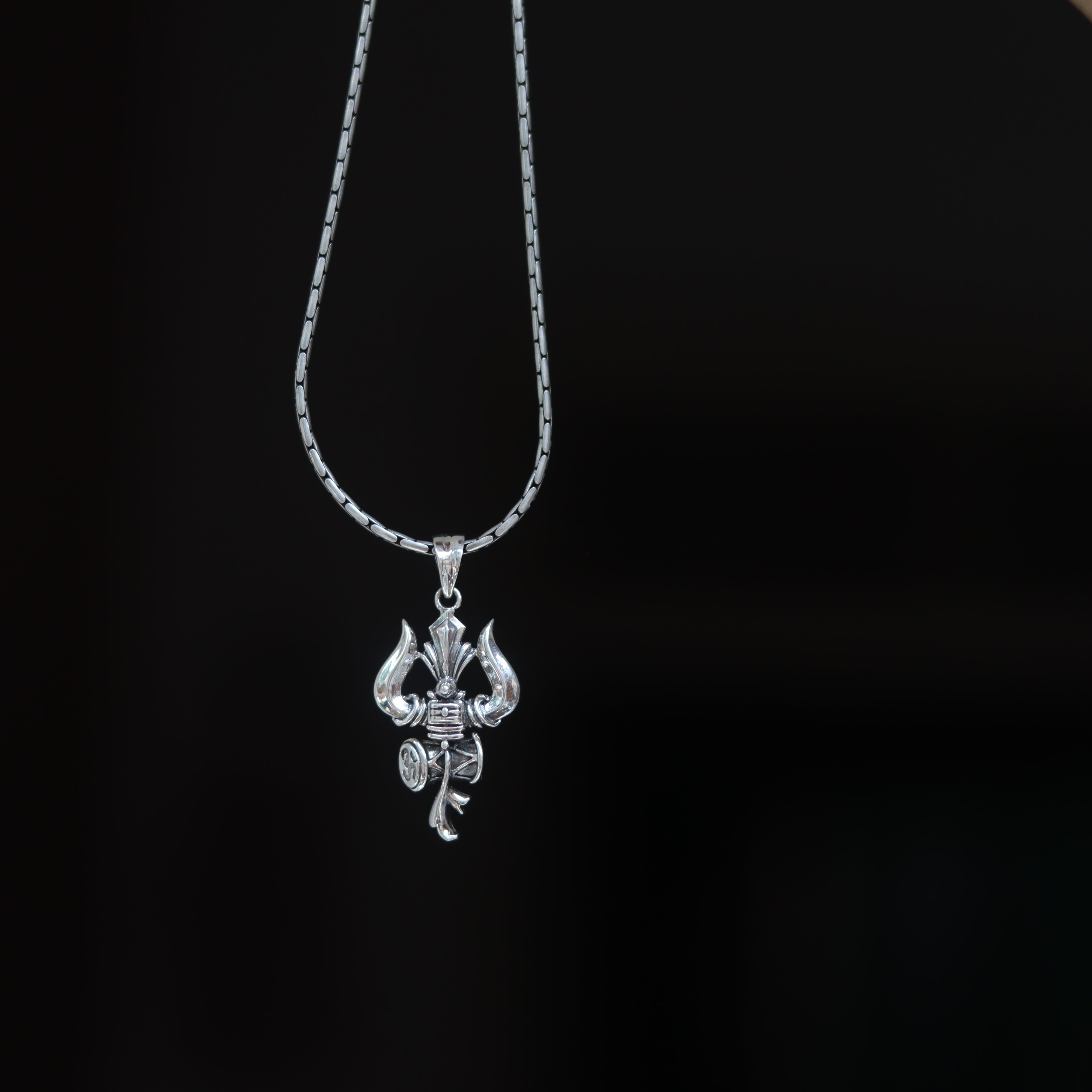 Command attention with the Vibrant Shiv Trishul Silver Pendant, featuring an edgy design and the Third Eye of Lord Shiva. This bold pendant combines modern style with deep spiritual significance, showcasing the Trishul for strength and the Third Eye for insight and vision. Crafted from 925 pure silver, itÕs available in two variants: with a matching silver chain or as a pendant only.